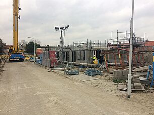 De bouw van dertig multifunctionele woningen in Breskens verloopt spoedig. De betonnen cascoās en de daken van alle vijf de bouwblokken zijn gereed. De aannemer is nu bezig met het metselen van de buitenwanden en ook de binnenafwerking is gestart.