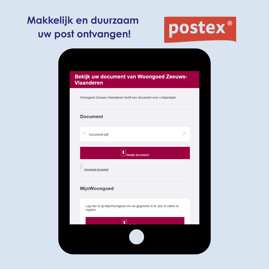 Ontvangt u post via Postex? Dan zult u zien dat er het één en ander verandert is. De pagina ziet er anders uit en er zijn enkele handige vernieuwingen. Zo kunt u een samenvatting laten maken van de brief, u kunt de tekst makkelijker leesbaar maken of de tekst vertalen in de door u gewenste taal. Daarnaast kunt u rechtstreeks linken naar MijnWoongoed, ons huurdersportaal.